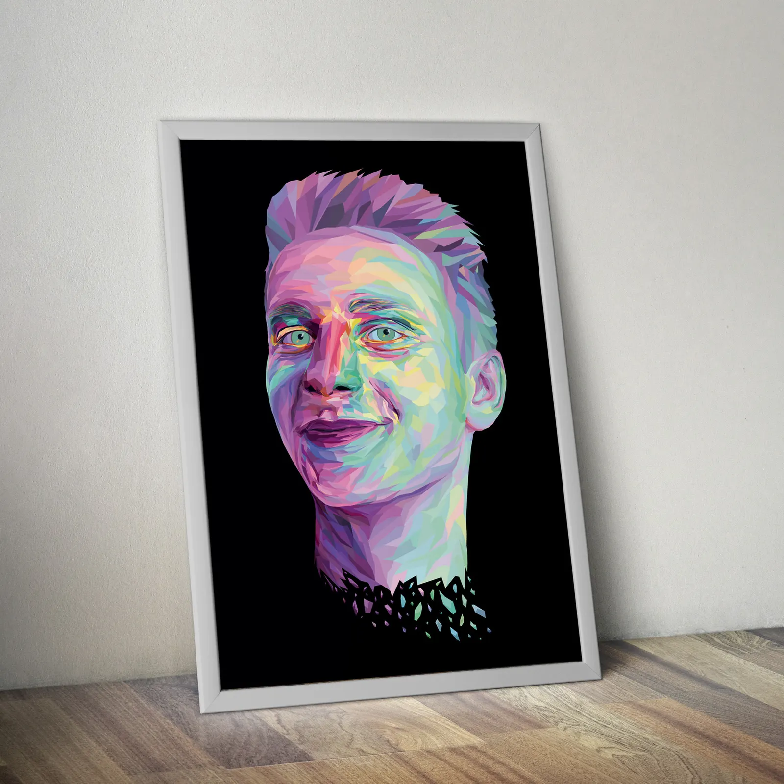 A vibrant low-poly pop art portrait illustration — geometric facets in pastel pinks, blues and greens layered over a deep black background, presented in a clean white frame. A signature illustration piece from the Only Loading studio.